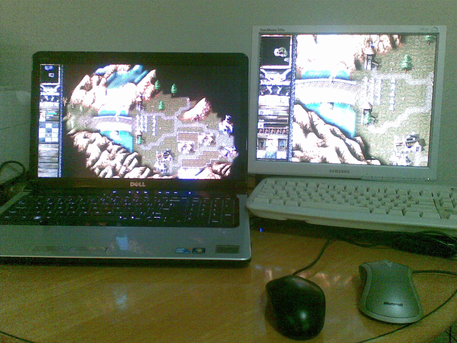 Now that singleplayer was mostly complete the team started to consider multiplayer. They already had replays for singleplayer which recorded commands from the user such as placing a building or moving a soldier. The plan had always been to use this same system to allow multiplayer, by delaying commands from the user long enough to send them to the other players. Krom had found an article from the developers of Age of Empires titled "1500 Archers on a 28.8: Network Programming in Age of Empires and Beyond" which described a system like this. A free UDP network library was found and after extensive discussion the development began. By April 2011 basic networking was working! Screenshots were posted showing a multiplayer game running on two separate computers. (see right)